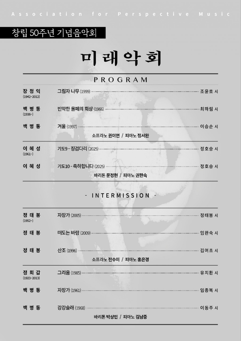 미래악회 창립 50주년 기념음악회 예술의전당 리사이틀홀 페이지 정보 작성자 최고관리자 작성일25-10-01 11:09 관련링크 이전글 다음글 목록 본문 미래악회 창립 50주년 기념음악회 예술의전당 리사이틀홀 이전글 다음글 목록